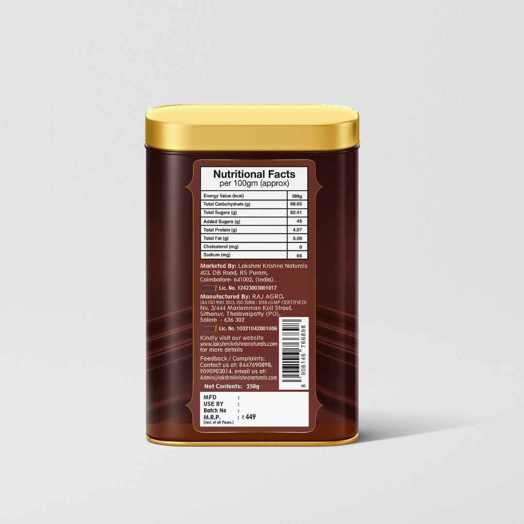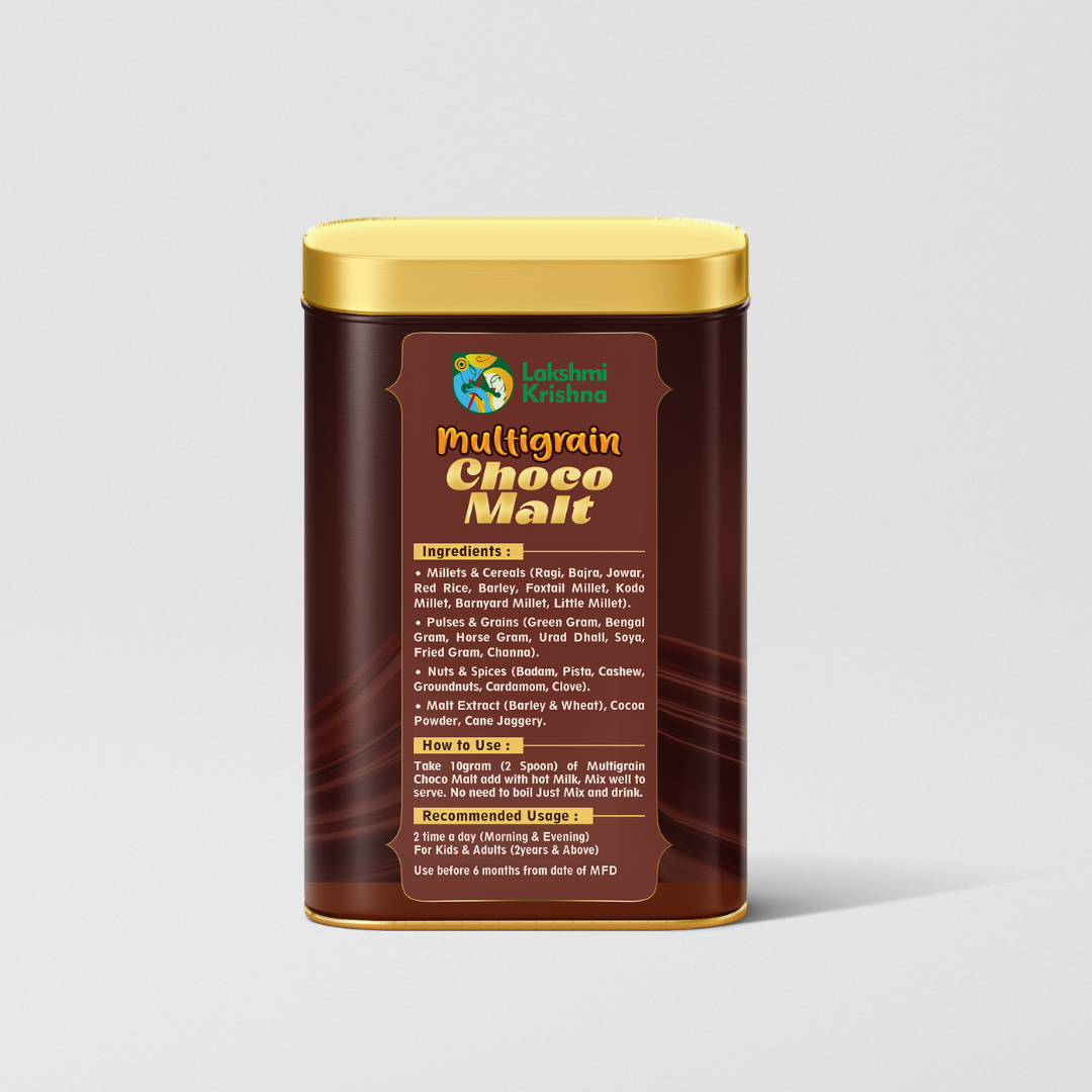 Fuel your day with the goodness of grains, pulses, and natural cocoa with Multi Grain Choco Malt β Instant Health Mix by Lakshmi Krishna Naturals. This delicious chocolate-flavored mix combines millets, legumes, cereals, nuts, and herbal extracts to deliver a wholesome nutritional drink for all age groups.