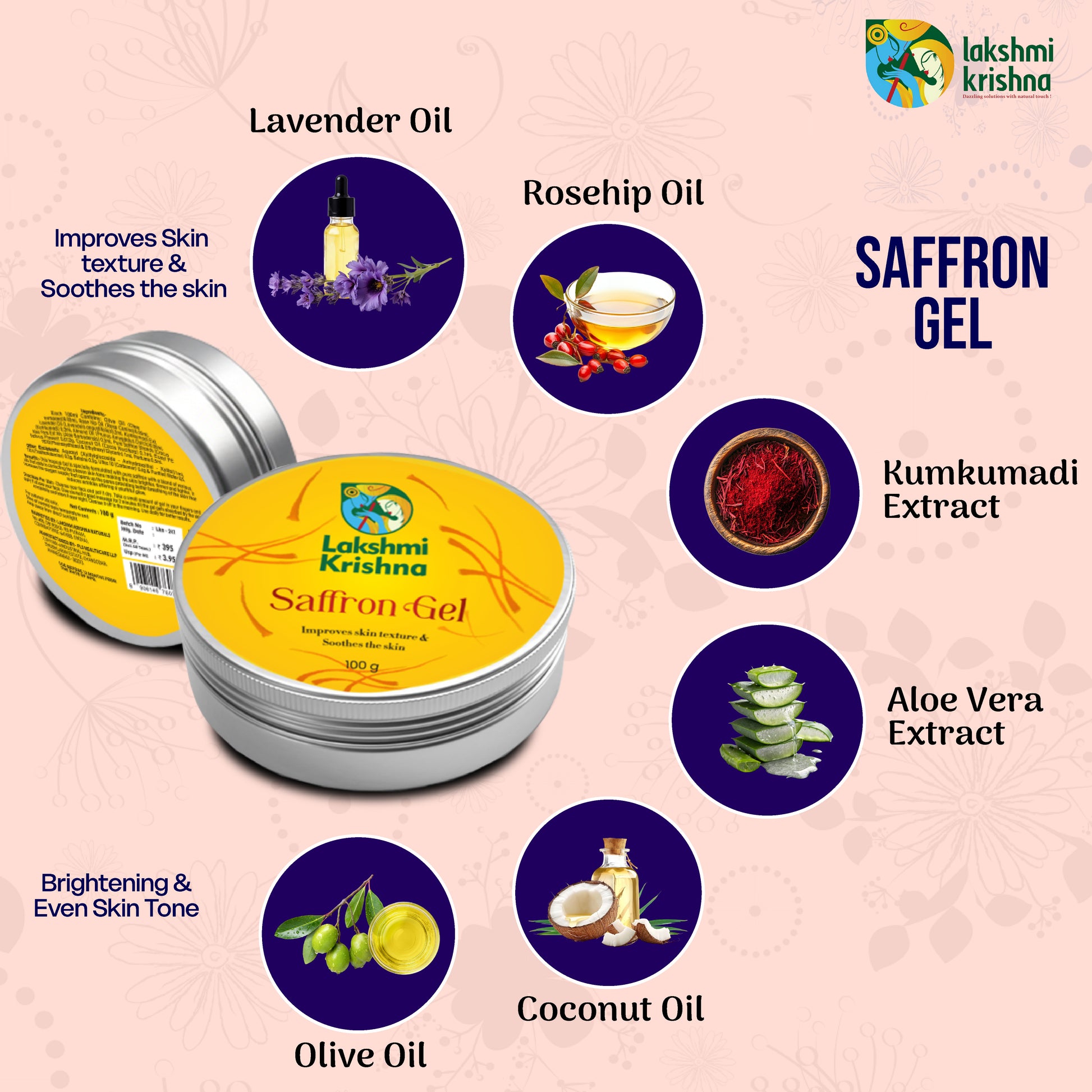 Saffron Night Gel is a popular skincare product.Β It contains Natural Extracts that give you the perfect glow and eliminate sun tan. Lakshmi Krishna Naturals Saffron Night Gel is best known for combating the indications of aging. The Saffron Night Gel benefits your skin by reducing dark complexion and brightening the skin tone. It deeply nourishes the skin, leaving your face fresh and naturally luminous.
