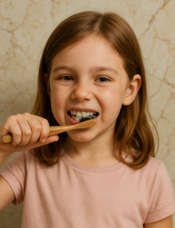 Charcoal Neem Toothbrush with bristles comprised of a mixture of neem tree fibers and activated charcoal. While neem fibers have long been utilized in Indian medicine for their antibacterial and anti-inflammatory effects, activated charcoal is well known for its capacity to remove surface stains and bacteria effectively. Together, these components make a healthy and potent toothbrush that can help with breath freshening and oral hygiene.